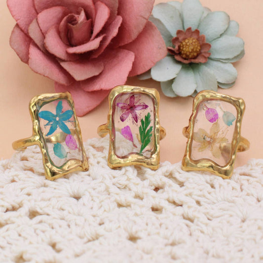 Rectangle Gold Dried Flowers Ring