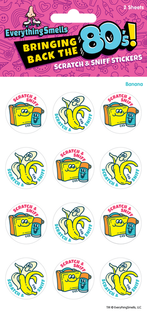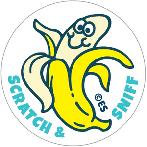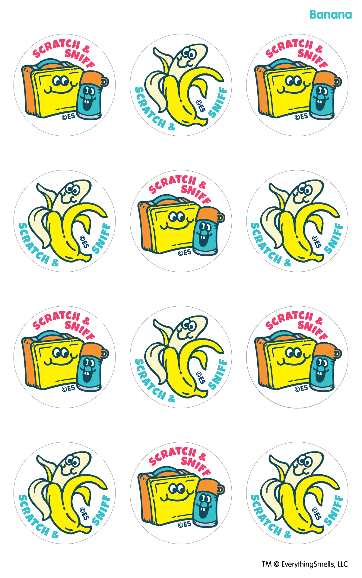 * Banana Scratch & Sniff Stickers * 2 images per sheet (banana and lunch box) * 2 sheets per package * 12 stickers per sheet/24 per pack * Matte stickers * Stickers are 1.125" round * Micro-encapsulated scratch & sniff * Phthalate-free fragrance! *