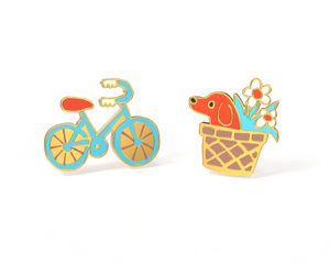 Bicycle & Dog Basket Mismatched Stud Earrings - 22K Gold Plated Cloisonné Add a touch of charm to your everyday look with these delightful mismatched stud earrings!
