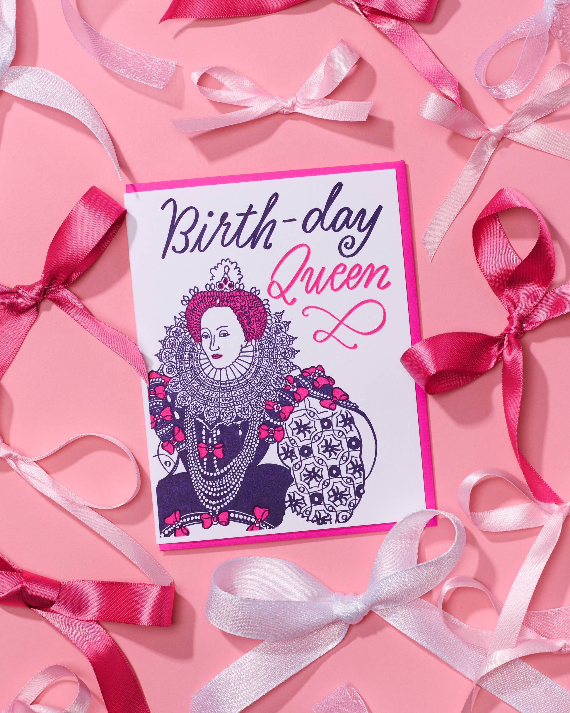 Happy birthday to an absolute Queen! • Card reads: "Birthday Queen" in an elegant script above a portrait of Queen Elizabeth I