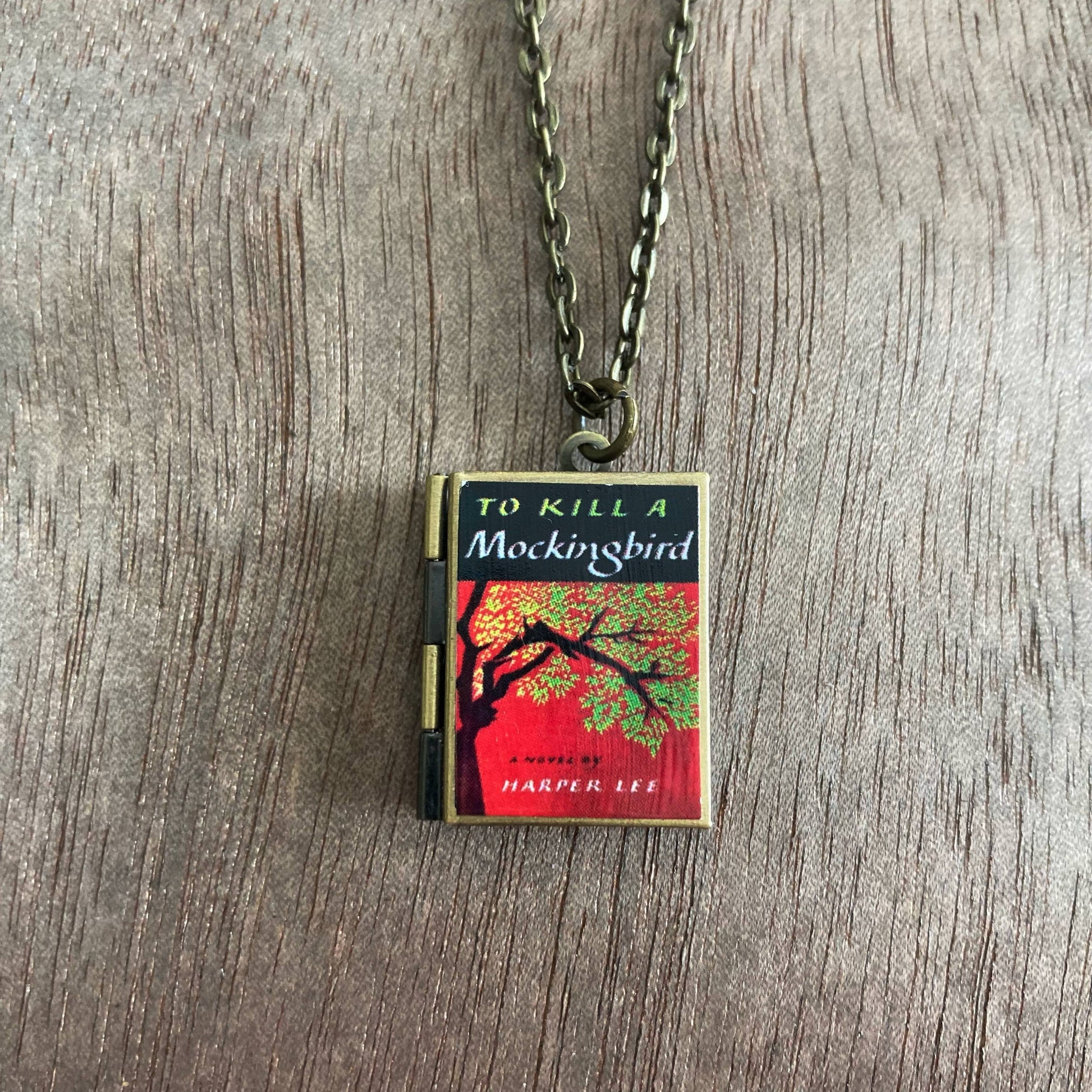Our book lockets are made with nickel free materials and feature the most beloved classic and modern books! They are on 24-inch chains and are sealed with a gloss finish for durability. Each locket can hold two pictures and can be purchased in stainless steel, bronze (as shown) or gold tone.