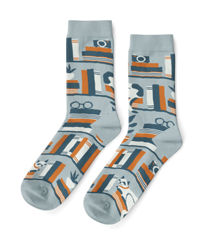 For the book lovers, cat people, plant parents, and vintage treasure hunters! These socks bring your favorite cozy corner to your feet. Rows of colorful books, leafy plants, retro cameras, glasses, and a curious cat perch on this charming bookshelf design.