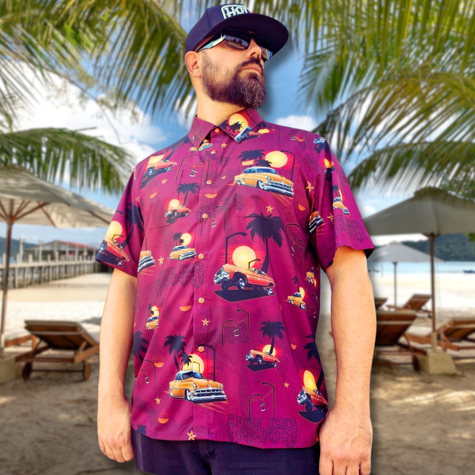 Take the Boulevard for a stylish cruise or gear up for your next Caribbean getaway with the limited edition Boulevard Shaka. Featuring a beautifully crafted artistic pattern of sunsets and palm trees over two iconic classic cars, a '64 Impala and '54 BelAir. This short sleeve is lightweight, silky smooth and equipped with pearlized sunset orange snaps. Step out in style and blaze the Boulevard!