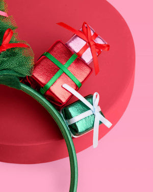 Green tulle Christmas tree with pink and red satin bows Approx. 7.08 x 7.87 x 4.33 inches for comfy wear Plastic headband with gold glitter star