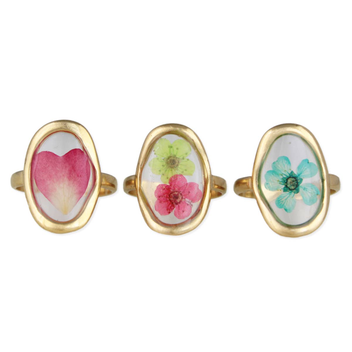 These beautifully colored dried flower gold rings are perfect cottage vibes!