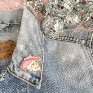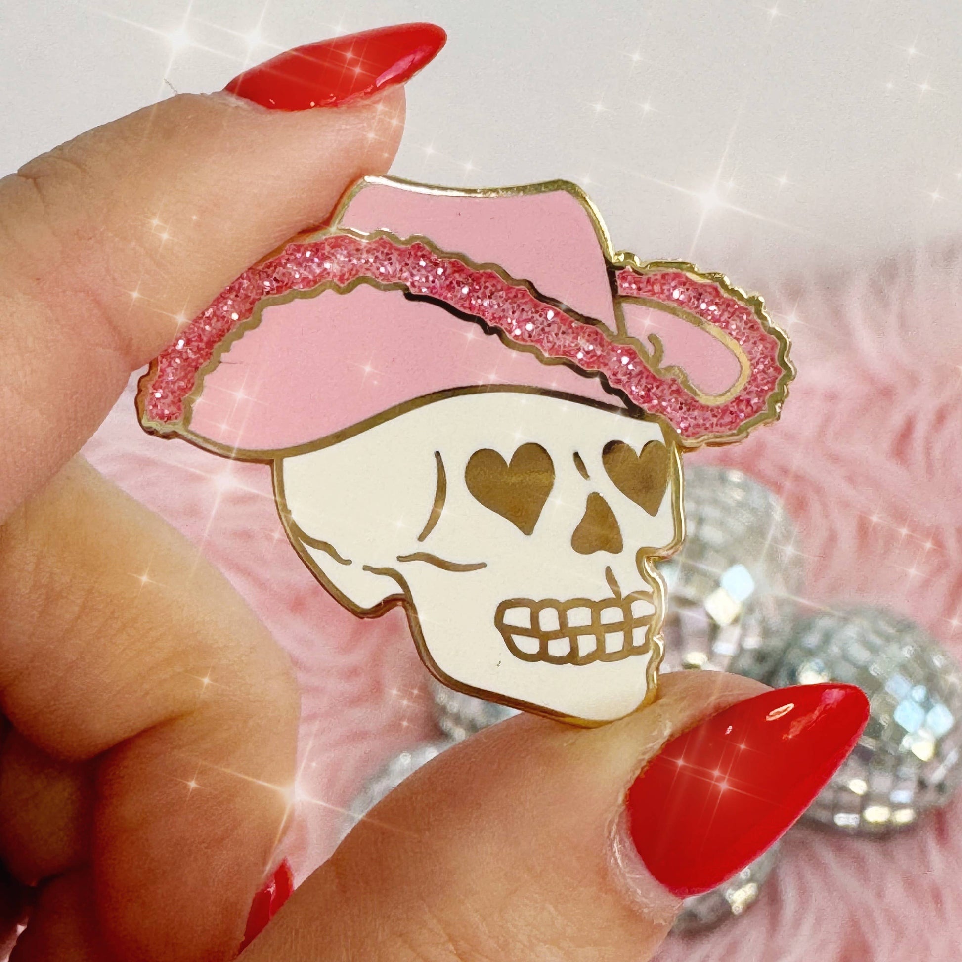 Our Cowgirl Skull Enamel Pin is perfect for Space Cowgirl - Disco Cowgirl themes & Bachelorette Parties (howdy Nashville, Austin!)!! This cute little skull has heart shaped eyes and a cowboy hat with a bright pink glitter trim.