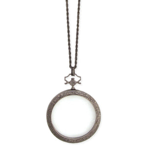The fashion game is afoot! Long twisted chain link necklace in dark antiqued silver features a real large ornate magnifying glass pendant. The antique style of this magnifier necklace will have you feeling quite mysterious!