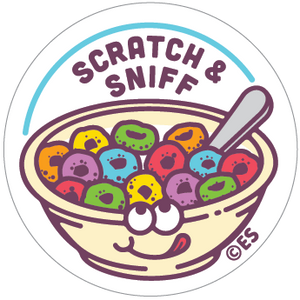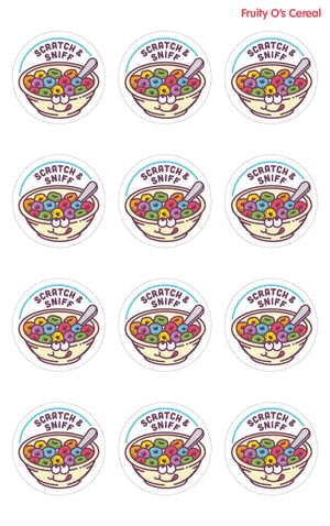 * Fruity Os Cereal Scratch & Sniff Stickers * 2 sheets per package * 12 stickers per sheet/24 per pack * Matte stickers * Stickers are 1.125" round * Micro-encapsulated scratch & sniff * Phthalate-free fragrance!