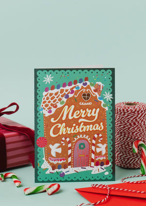 Gingerbread house Christmas card, from the festive edition of the fabulous Hot Foils collection. The Hot Foils collection is made in collaboration with South London based artist Jess aka Hot Foils.
