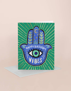 Our hand-painted hamsa is painted in colorful jade and cobalt shades, accented with shiny gold foil detail. The perfect card for sending the best birthday vibes. Idlewild Co. greeting cards feature our original, hand-painted illustrations, and are printed in vibrant color on beautiful, opaque FSC-Certified papers.