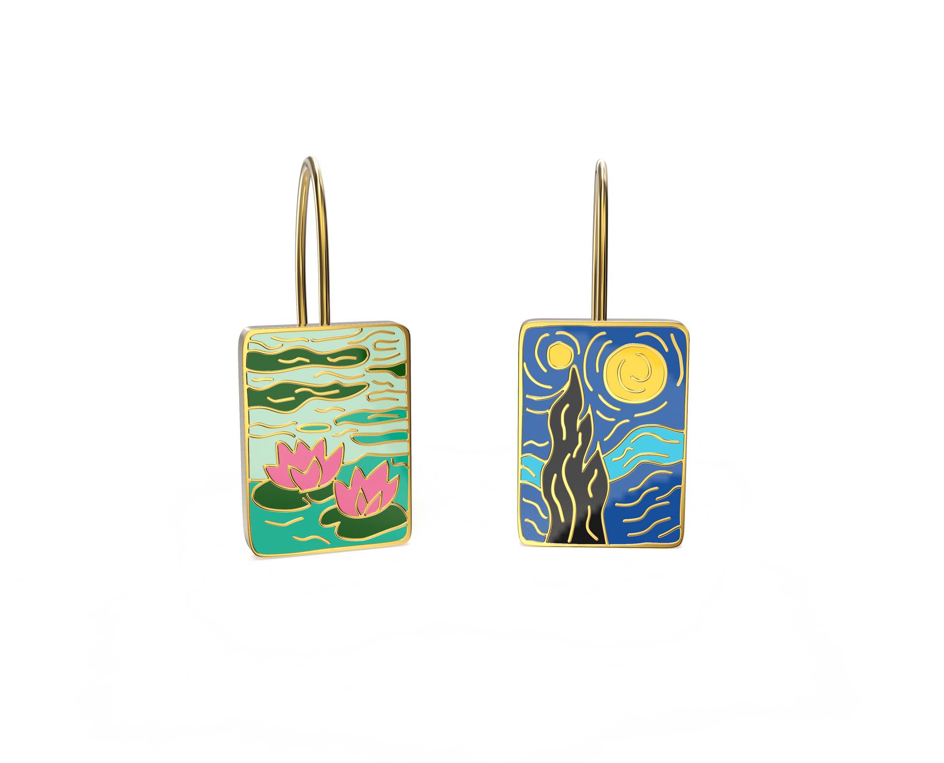 A nod to two masters of color. This enamel pair draws from the palettes of Monet and Van Gogh, soft brushstrokes, bold hues, and layered textures that give a painterly feel in a wearable form.