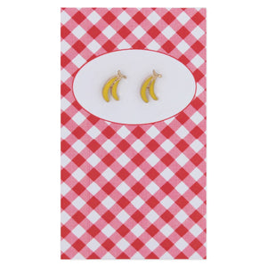* Made in China * Tiny banana bunch post earrings * Carded on red gingham picnic inspired cards * Measures (approx.): 3/8 x 1/4" * Materials: Gold Tone Metal, Enamel * *