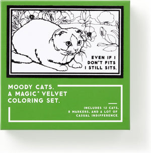 VELVET COLORING SET - This set of twelve black velvet cat illustrations are dripping with nostalgia–and the casual indifference that you would expect from our favorite feline companions. Each moody cat is emblazoned with a phrase that will likely hit a little too close to home to any cat owner–like ‘please rub my belly, I want to shred your arm to bits.’