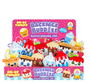Backpack Buddies Oh So Yummy Dessert Shop are scented stuffed plush that come attached with a backpack clip. There are 6 different characters all with their own unique scent. Each Backpack Buddy is filled with super soft stuffing and gourmet scented beads.