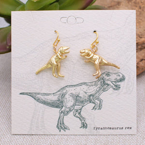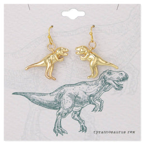 • Made in China • Gold Tyrannosaurus rex earrings • Prehistoric inspired dino earrings in gold • Materials: Gold Tone Metal • Measurements: 1 1/8 x 1 1/4"