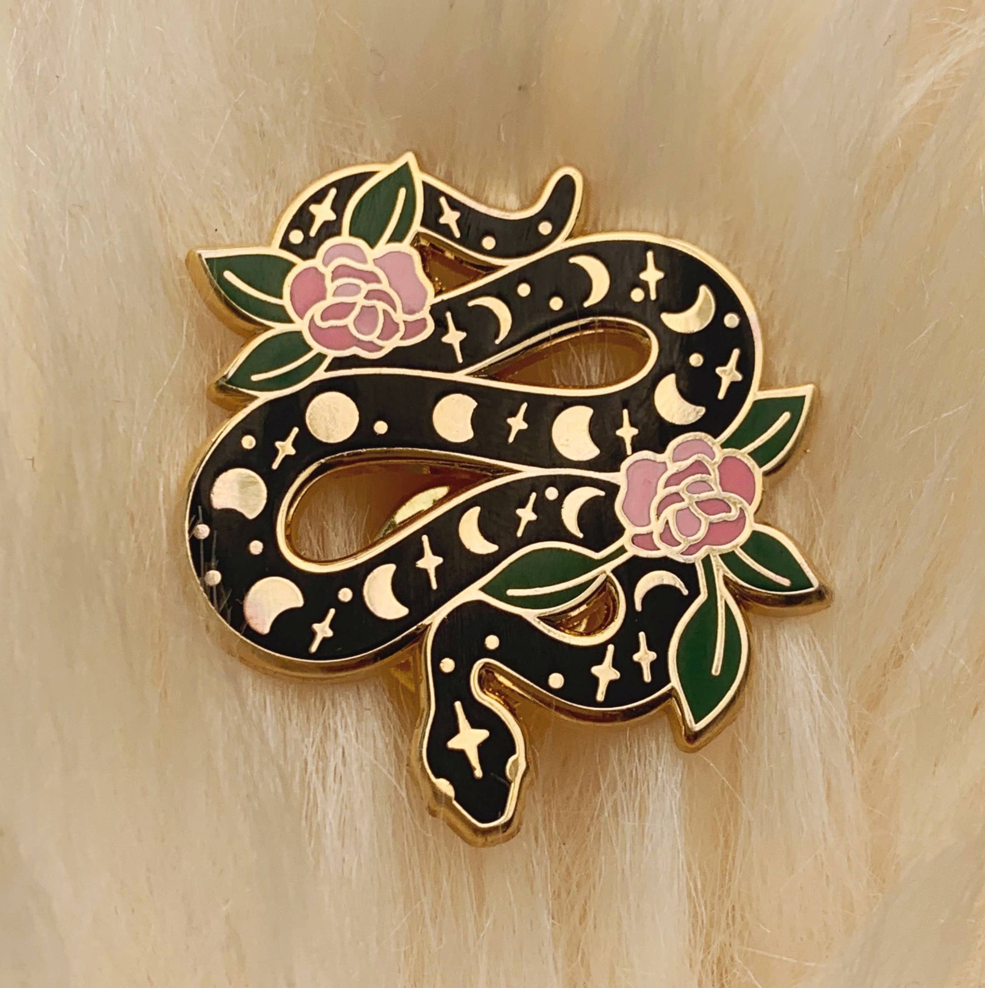 Magical snake enamel pin is intricately detailed with the moon phases & gorgeous pink flowers winding its way through the serpent.