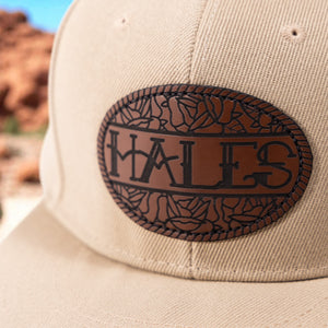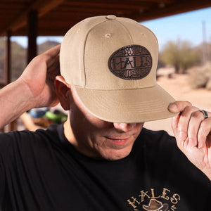 This khaki high-profile flat bill cap features a rich brown leather oval patch that’s stitched down, not slapped on. Flip the bill and you’ll find a custom Caballero underbill print—a subtle nod to those who know the code but don’t need to shout it.
