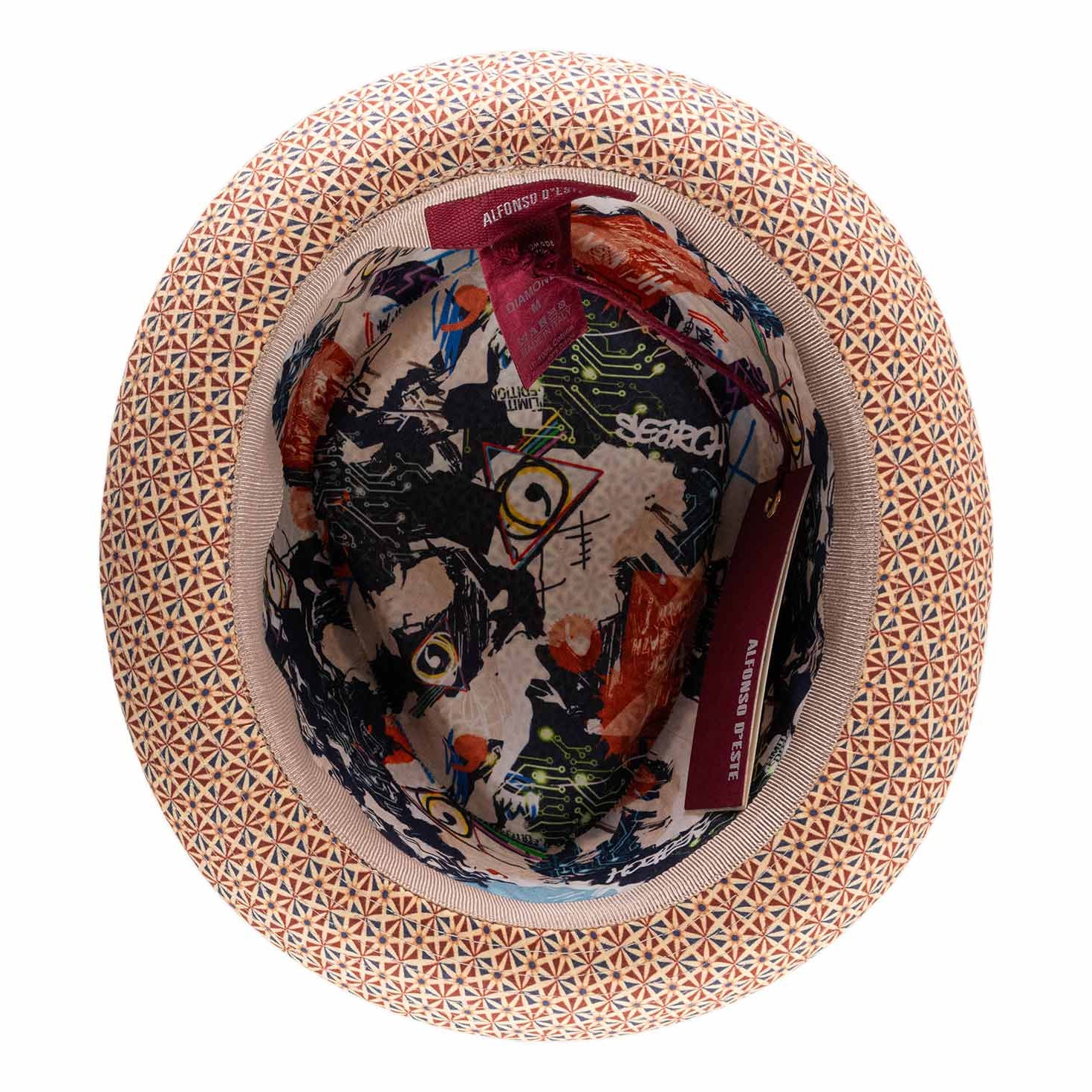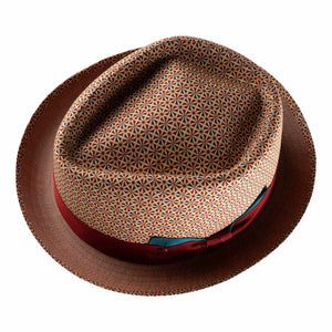 The Deco Summer Porkpie by Alfonso d’Este brings a playful twist to classic style with its eye-catching geometric pattern and contrasting braid. Its flat shape and upturned brim create a bold silhouette that stands out, while the light, comfortable fit lets you wear it all day with ease. Inside, an artistic lining adds a fun, retro flair that makes this hat a charming statement piece for any sunny day.