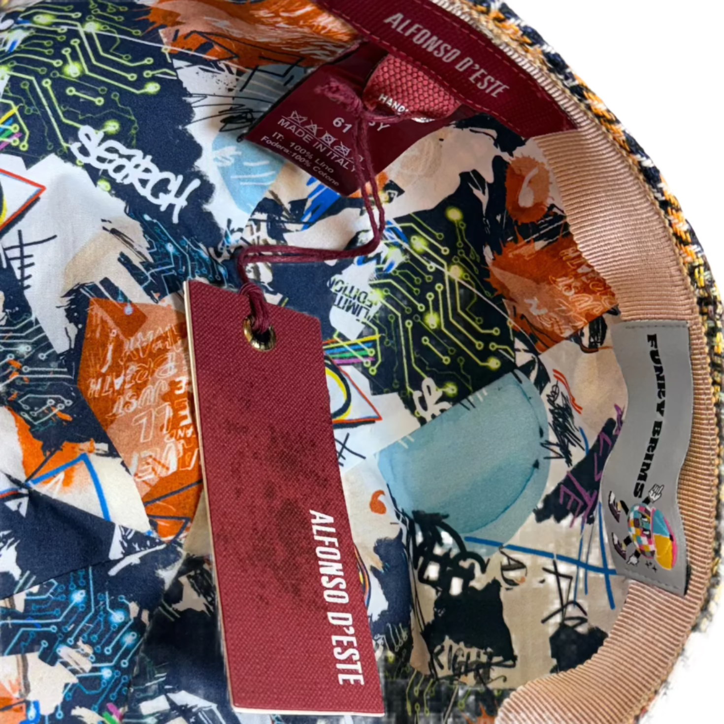 Brand: Alfonso D’Este Model: Shelby Material: 100% Italian Linen Lining: 100% Printed Cotton Brim: 5.5 cm Style: 8-Panel Newsboy / Hatteras Cap Made in Italy
