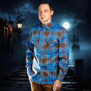Rum-dark nights and salt-scarred decks—17th-century Port Royal was the Caribbean’s underworld, where pirates traded gold for glory and taverns ran on smuggled spirits. Our blue-and-brown plaid channels that same raw grit, its storm-tossed hues echoing wind-whipped waves and tavern lanterns cutting through the gloom. Blue pearlized snaps glint like hidden treasure, and every thread carries the echo of cannon fire and whispered deals in moonlit alleyways. This is more than a flannel—it’s a legend you wear.
