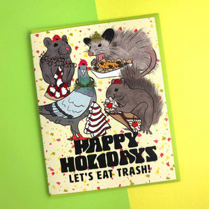Blank inside and sealed in a protective cellophane sleeve. Size A2 (4.25" x 5.5"). Card reads "Happy Holidays! / Let's Eat Trash!" and features illustrations of a pizza-loving rat, a pigeon with a holiday snack cake, a squirrel with a cannoli, and a possum feasting on nachos.