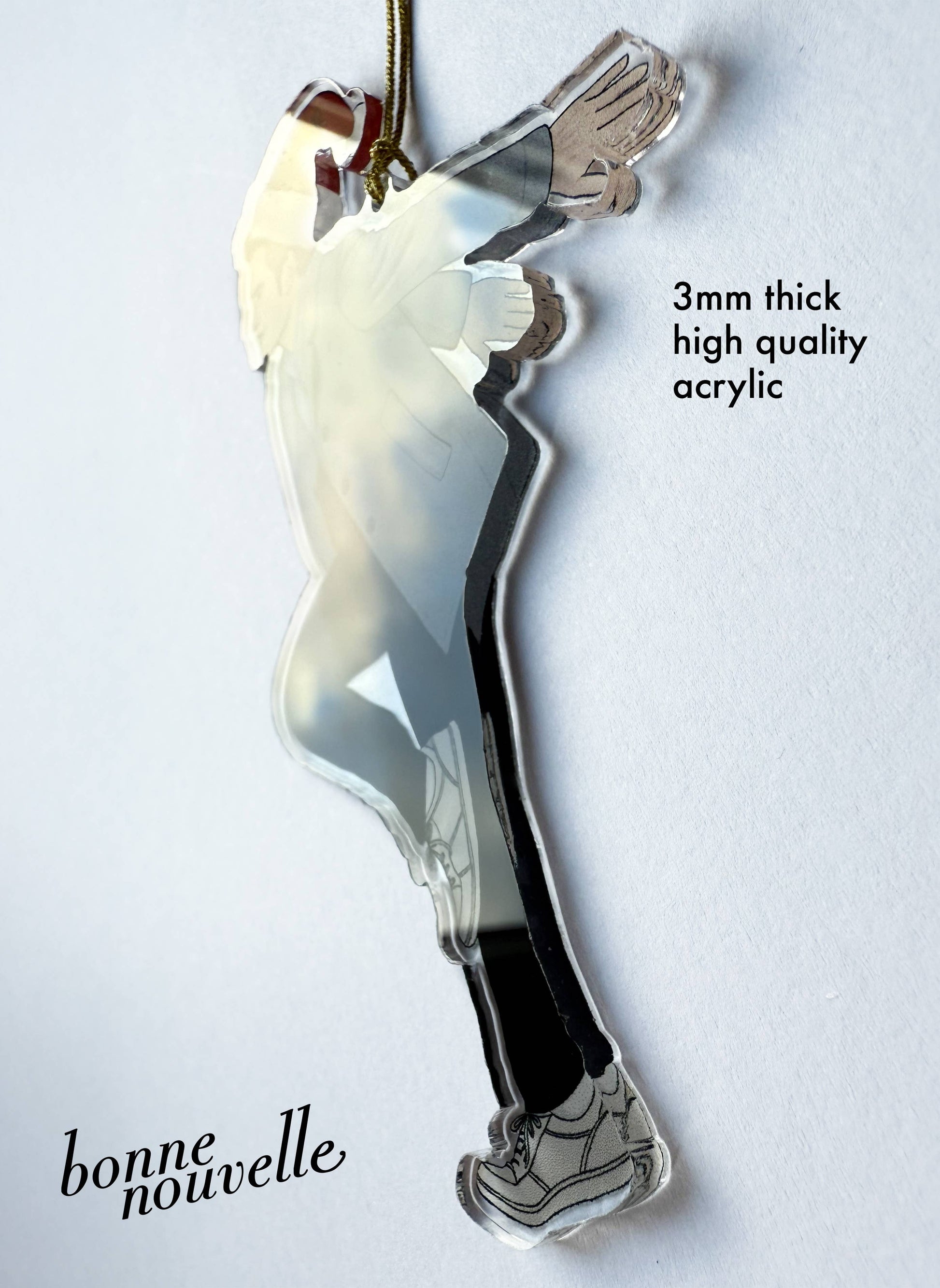 • High quality clear acrylic • 3mm thick, 100 mm high • Gold cord for hanging on your Christmas tree • Double sided print • Designed & manufactured in Britain •