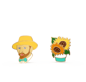 Featuring the man himself and an ode to his famous sunflowers, our Van Gogh Stud Earrings are the ultimate gift for art lovers. These petite earrings are perfect for museum gift shops, museum curators, art history lovers and teachers, painters, and anyone who admires the famed Dutch oil painter. Presented in our original glass vial packaging. The mismatched yet perfectly paired cloisonné studs are gilded in 22-karat gold and have hypoallergenic posts. Each earring is 0.5" (1.3 cm) or slightly smaller.