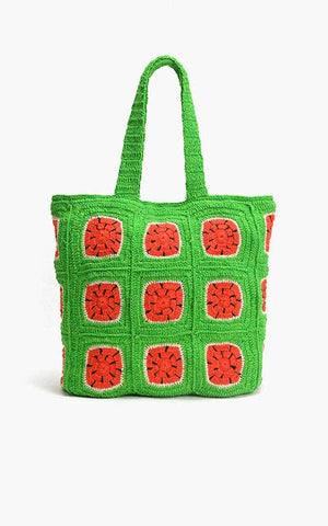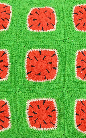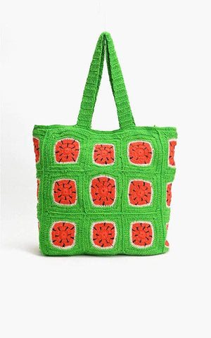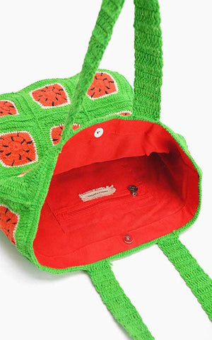 Multi-purpose crochet tote * Comfortable double shoulder straps * Crafted with comfort in mind, featuring double shoulder straps for easy carrying. * Vibrant watermelon design adds a playful twist to your ensemble. * Versatile size offers ample space for towels, sunscreen, snacks, and more. * Metallic button closure * Made in a durable fabric * Fully lined interiors with zip pocket inside * Size: 18" x 15" x 5"
