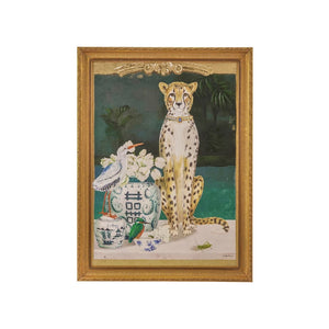 Add a splash of wild charm to your space with this Wood Framed Canvas Wall Décor featuring a cheetah and urn image. The antique gold finish adds a touch of vintage glow, while the vibrant multi-color design keeps things lively and fun. Perfect for anyone looking to bring nature's speed and style into their home with a playful twist.